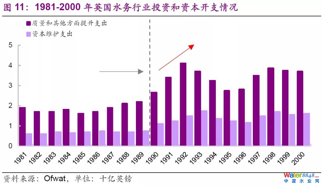 (2)英國(guó)水務(wù)行業(yè)私有化是英國(guó)私有化運(yùn)動(dòng)浪潮下的必然結(jié)果,對(duì)行業(yè)發(fā)展起到了正面推動(dòng)作用。1973年英國(guó)經(jīng)濟(jì)滯脹后,英國(guó)保守黨執(zhí)政并主張通過(guò)減少國(guó)家干預(yù)、發(fā)揮市場(chǎng)機(jī)制的方法來(lái)重新啟動(dòng)經(jīng)濟(jì)發(fā)展,這也開(kāi)啟了英國(guó)歷史上規(guī)模最大、范圍最廣的私有化運(yùn)動(dòng),而英國(guó)水務(wù)私有化正是在私有化運(yùn)動(dòng)的大背景下進(jìn)行的。水務(wù)行業(yè)私有化后,投資及資本開(kāi)支的力度顯著增加、河流及應(yīng)用水水質(zhì)明顯改善、水廠運(yùn)營(yíng)成本得到有效控制,行業(yè)重回快速發(fā)展軌道。