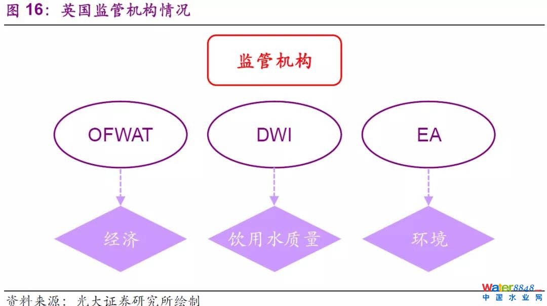二是英國(guó)水務(wù)行業(yè)擁有完善的監(jiān)管架構(gòu)。英國(guó)水務(wù)公司受到水務(wù)服務(wù)管理局(Office of Water Services,簡(jiǎn)稱Ofwat)、環(huán)境局(Environment Agency,簡(jiǎn)稱EA)和英國(guó)飲用水監(jiān)察局(Drinking Water Inspectorate,簡(jiǎn)稱DWI)的共同監(jiān)管,其監(jiān)管方向有所不同: