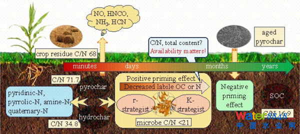 綜述論文厘清了生物炭(biochar)、熱解炭(pyrochar)和水熱炭(hydrochar)的定義內涵;比較了熱解炭、水熱炭在土壤環(huán)境不同穩(wěn)定性及主控因素;探討了熱解炭和水熱炭誘導土壤有機碳分解的激發(fā)效應作用機制等關鍵問題。文章首次提出了土壤環(huán)境中有效態(tài)C/N化學計量比是影響生物炭穩(wěn)定性和有機碳在土壤環(huán)境轉化的關鍵因素的觀點(圖2);闡述了生物炭中氮形態(tài)轉化對土壤生態(tài)系統(tǒng)溫室氣體排放的重要貢獻;通過對生物炭在土壤應用閾值、經(jīng)濟成本等方面限制生物炭在土壤固碳應用因素的分析,建議開展應用生命周期評價方法指導生物炭的固碳應用、降低其環(huán)境風險的相關研究。