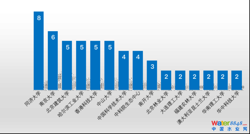 本特刊開(kāi)放投稿系統(tǒng)后,共收到260篇稿件,經(jīng)全球?qū)徃遄罱K共收錄發(fā)表了76篇高質(zhì)量論文。據(jù)統(tǒng)計(jì),接收的文章共來(lái)自34家研究主體(基于第一單位統(tǒng)計(jì)),其中,收錄在2篇以上的同一研究主體分布如下圖所示,同濟(jì)大學(xué)貢獻(xiàn)8篇,可見(jiàn)其在水研究領(lǐng)域的活躍;南京大學(xué)以6篇位居其次, 北京建筑大學(xué)、哈爾濱工業(yè)大學(xué)、香港科技大學(xué)和中山大學(xué)并列第三位,分別貢獻(xiàn)5篇。其中,84%的收錄文章得到了國(guó)家自然科學(xué)基金委的資助。從文章主題分類(lèi)來(lái)看,分享污水/污泥處理成果的文章共計(jì)46篇,為本特刊研究的熱點(diǎn)主題;其余主題關(guān)注熱度依次為能源/資源回收(11篇)、飲用水安全保障(11篇)、管道系統(tǒng)管理與維護(hù)(4篇)、黑臭水體治理(3篇)以及海綿城市建設(shè)(1篇)。