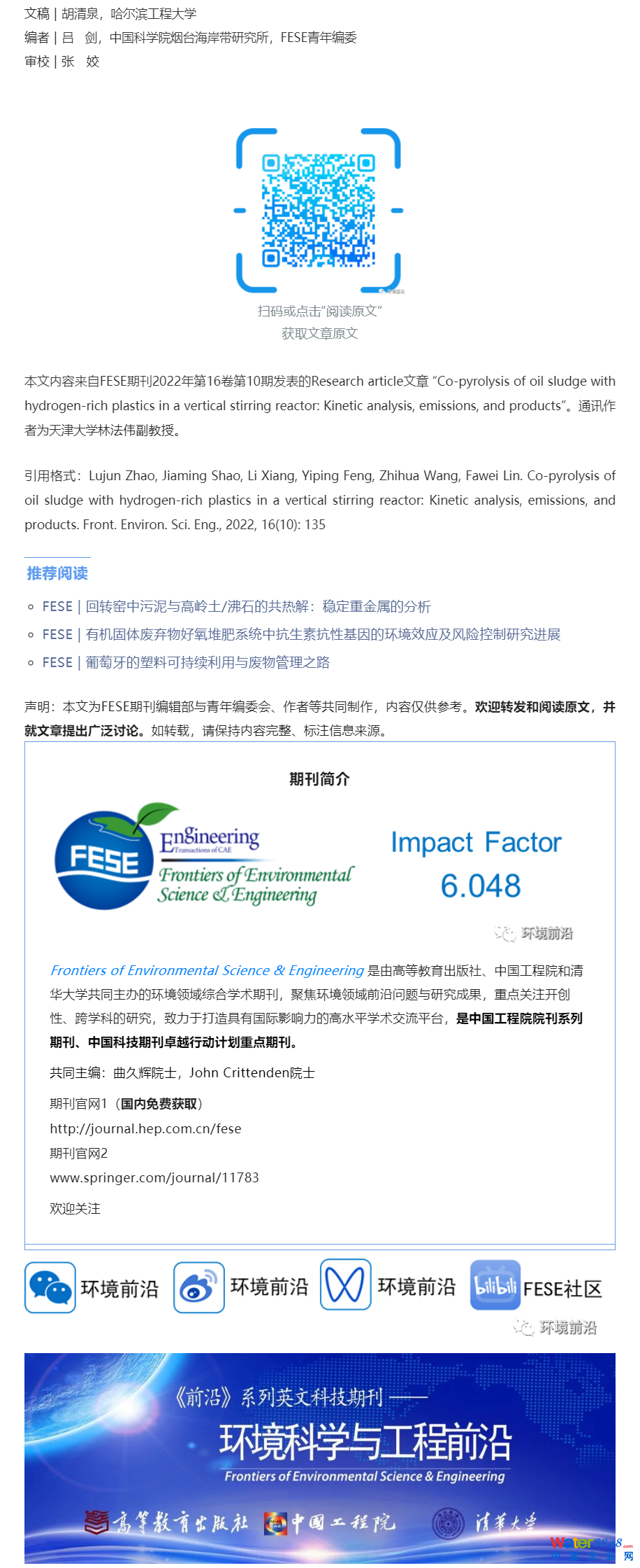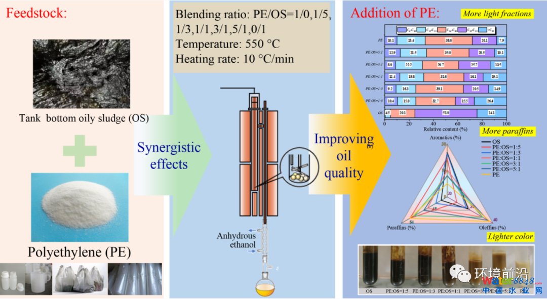 熱解法是石油工業(yè)中含油污泥(以下簡(jiǎn)稱油泥)無(wú)害化處置和資源化利用的途徑之一,但高含量重餾分導(dǎo)致油泥直接熱解產(chǎn)生的油品不能滿足高效清潔利用要求。本研究將聚乙烯塑料添加到油泥中,以調(diào)節(jié)熱解原料的H/C比,使油泥和聚乙烯塑料產(chǎn)生強(qiáng)烈的共熱解過(guò)程,生成物具有較高的熱值、較多短鏈輕餾分和鏈烷烴含量,改善了油產(chǎn)品品質(zhì)。