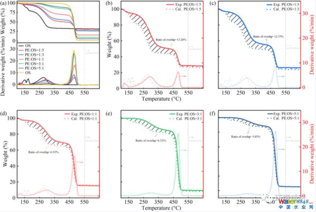 圖2 (a)油泥、聚乙烯塑料及其混合物的熱重曲線;(b)–(f)混合物熱重曲線的實(shí)驗(yàn)值和計(jì)算值的對(duì)比 (圖中OS為油泥,PE為聚乙烯塑料)