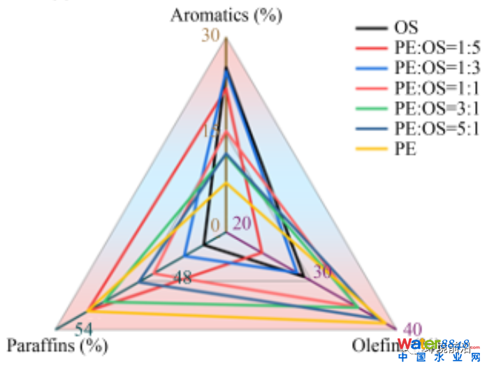 圖3 油泥、聚乙烯塑料及其混合物熱解產(chǎn)油成分 (圖中OS為油泥,PE為聚乙烯塑料)