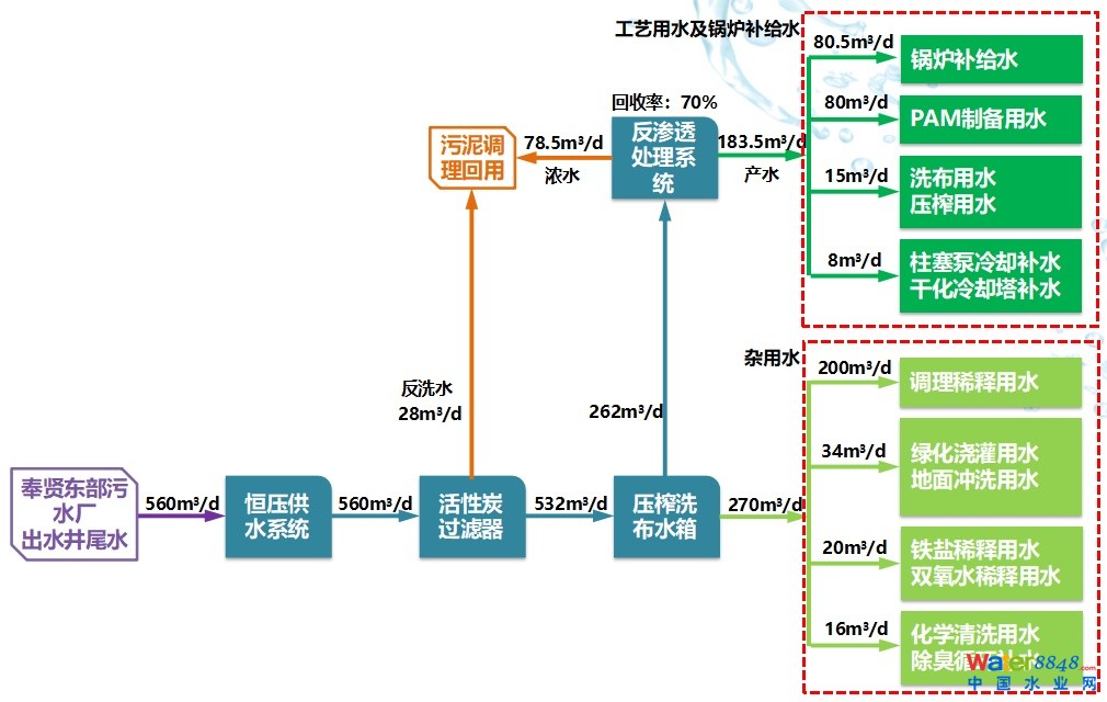 其中,雜用水滿(mǎn)足《城市污水再生利用 城市雜用水水質(zhì)》(GB/T 18920-2020)的標(biāo)準(zhǔn)要求,主要用于:稀釋用水、化學(xué)清洗用水、除臭循環(huán)補(bǔ)水、地面沖洗用水、沖廁用水等;工藝用水滿(mǎn)足《城市污水再生利用 工業(yè)用水水質(zhì)》(GB/T 19923-2005)中溶解性總固體≤1000mg/L,濁度≤5NTU等要求,主要用于:PAM制備用水、柱塞泵冷補(bǔ)水、洗布用水、壓榨補(bǔ)水、干化冷卻水塔補(bǔ)水等;鍋爐補(bǔ)給水滿(mǎn)足《工業(yè)鍋爐水質(zhì)》(GB/T 1576-2018)的標(biāo)準(zhǔn)要求,其中濁度≤5FTU,總硬度≤0.03mmol/L,pH7.0〜10.5,含油量≤2mg/L,含鐵量≤0.3mg/L。