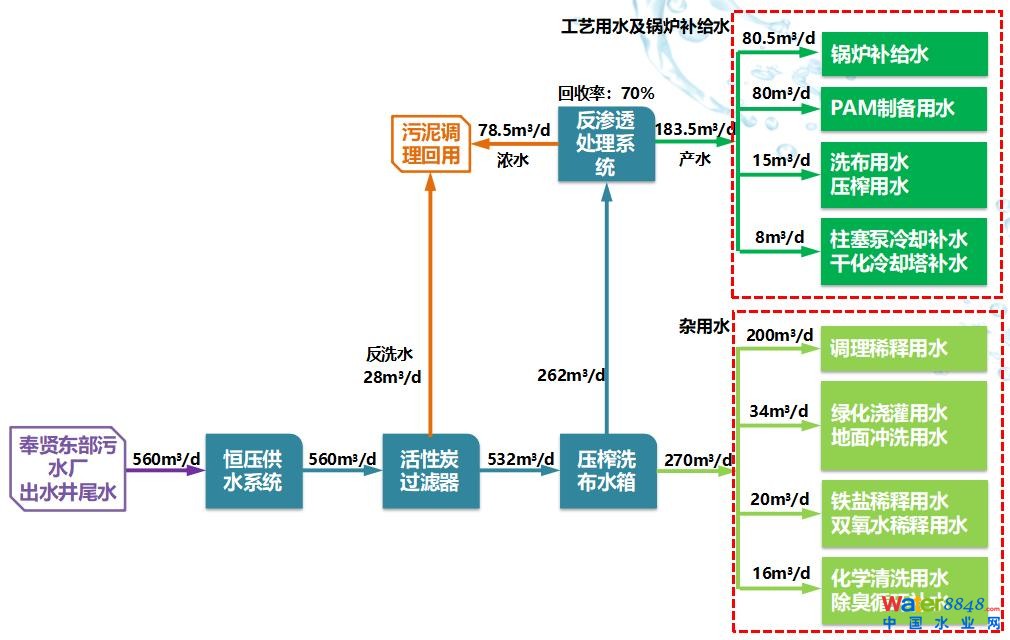 其中,雜用水滿足《城市污水再生利用 城市雜用水水質(zhì)》(GB/T 18920-2020)的標(biāo)準(zhǔn)要求,主要用于:稀釋用水、化學(xué)清洗用水、除臭循環(huán)補(bǔ)水、地面沖洗用水、沖廁用水等;工藝用水滿足《城市污水再生利用 工業(yè)用水水質(zhì)》(GB/T 19923-2005)中溶解性總固體≤1000mg/L,濁度≤5NTU等要求,主要用于:PAM制備用水、柱塞泵冷補(bǔ)水、洗布用水、壓榨補(bǔ)水、干化冷卻水塔補(bǔ)水等;鍋爐補(bǔ)給水滿足《工業(yè)鍋爐水質(zhì)》(GB/T 1576-2018)的標(biāo)準(zhǔn)要求,其中濁度≤5FTU,總硬度≤0.03mmol/L,pH7.0〜10.5,含油量≤2mg/L,含鐵量≤0.3mg/L。