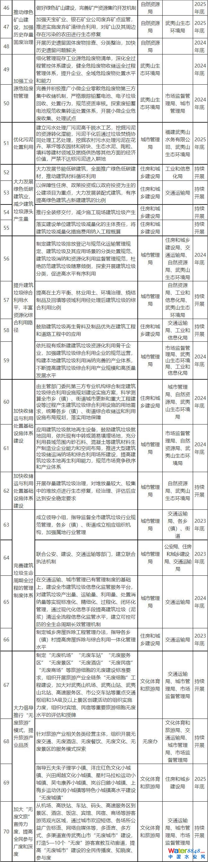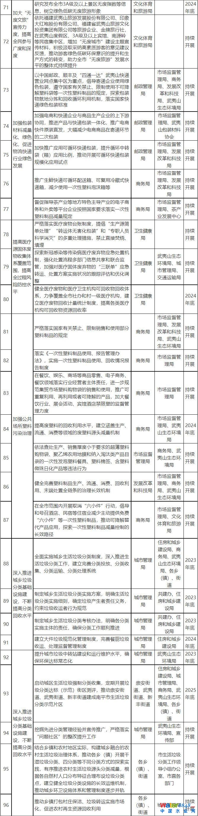 《方案》提出,武夷山市“無廢城市”建設(shè)以生活固體廢物、建筑垃圾、一般工業(yè)固體廢物、危廢、農(nóng)業(yè)固體廢物治理為重點(diǎn),推進(jìn)固體廢物源頭減量!斗桨浮妨谐龈黝I(lǐng)域推進(jìn)“無廢城市”建設(shè)的各項(xiàng)任務(wù),包括發(fā)展農(nóng)業(yè)循環(huán)經(jīng)濟(jì),提升固體廢物綜合治理水平;加快工業(yè)綠色低碳轉(zhuǎn)型,降低工業(yè)固廢處置利用壓力;加強(qiáng)全過程規(guī)范化管理,推進(jìn)建筑垃圾收集綜合利用;大力倡導(dǎo)“無廢+”理念,助力特色服務(wù)產(chǎn)業(yè)品質(zhì)提升;推進(jìn)綠色低碳生活方式,促進(jìn)生活垃圾減量化資源化;提高制度、技術(shù)、市場、監(jiān)管體系保障水平,全力打造生態(tài)旅游城市樣板等。