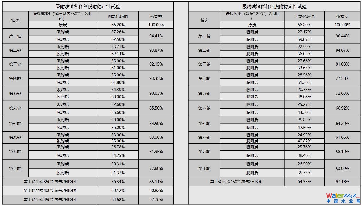從上表試驗(yàn)數(shù)據(jù)可以看出,高溫解吸(炭層溫度250℃),每一個(gè)吸附飽和解吸周期后四氯化碳值呈逐步的下降趨勢,而低溫解吸(炭層溫度120℃),四氯化碳值下降速度更快了。我公司高溫解吸(炭層溫度250℃)5個(gè)吸附飽和解吸周期后,活性炭四氯化碳值的恢復(fù)率都能保證在90%以上,而低溫解吸(炭層溫度120℃)5個(gè)吸附飽和解吸周期后活性炭四氯化碳值的恢復(fù)率已經(jīng)下降到72.63%。這就說明低溫解吸(炭層溫度120℃)每一輪次吸附解吸后活性炭的吸附性能呈遞降趨勢,每一個(gè)飽和解吸周期后吸附飽和周期會縮短,若干次飽和解吸周期后活性炭就不能再使用。由于市場上采用的120℃熱空氣再生,實(shí)際炭層溫度80~100℃,四氯化碳值恢復(fù)率會遠(yuǎn)低于表中的低溫解吸試驗(yàn)數(shù)據(jù),活性炭的吸附能力下降得更快,飽和周期更短。