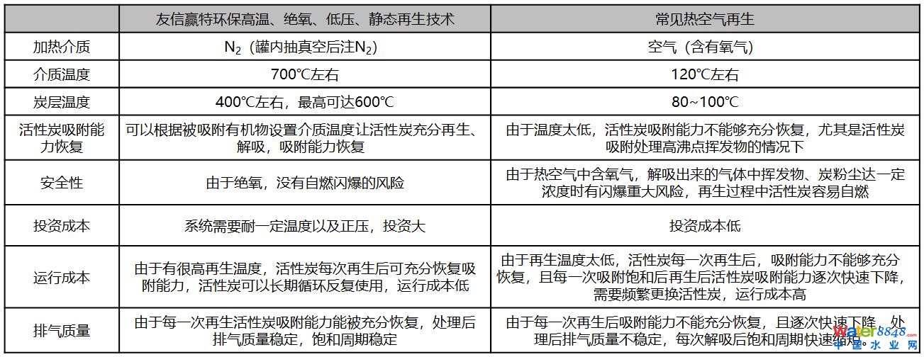 友信贏特環(huán)境高溫、絕氧、低壓、靜態(tài)活性炭創(chuàng)新再生技術(shù)和市場常見的低溫?zé)峥諝庠偕夹g(shù)指標(biāo)的比較