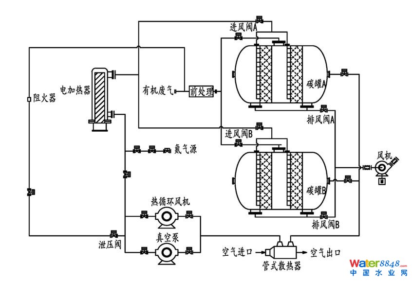 b. 采用兩個(gè)或兩個(gè)以上活性炭吸附再生罐對廢氣進(jìn)行吸附處理。當(dāng)其中一個(gè)吸附再生罐吸附飽和后,停止吸附,關(guān)閉相應(yīng)進(jìn)風(fēng)閥、排風(fēng)閥。同時(shí)啟用另一個(gè)吸附再生罐進(jìn)行吸附處理,并對已飽和的吸附再生罐進(jìn)行高溫、絕氧、低壓、靜態(tài)再生,恢復(fù)活性炭的吸附能力。