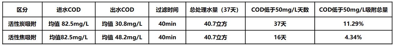 1、過濾時間一致時,活性焦吸附的出水明顯劣于活性炭。若出水要求為一級A,那么活性焦達標天數(shù)只有16天,比活性炭少21天。
