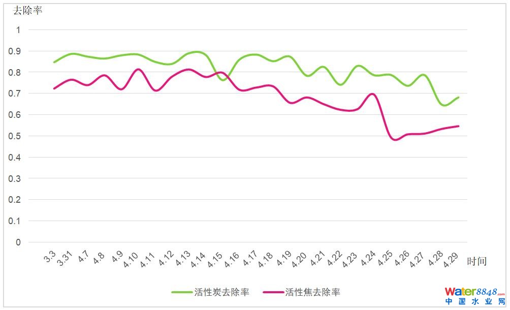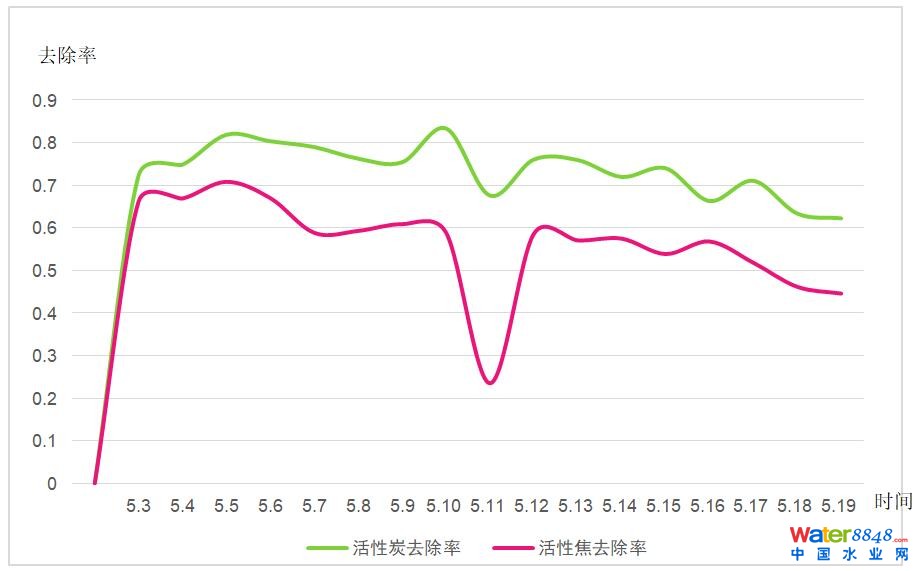 1.相同原水、相同過濾時間的條件下活性炭的出水遠優(yōu)于活性焦。從數(shù)據(jù)上分析:活性炭10天后的出水去除率仍大于80%, 且10天內(nèi)出水的去除率并沒有較大變化、而活性焦的出水去除率超過50%的時間只有3天,3天后去除率呈快速下降的趨勢。