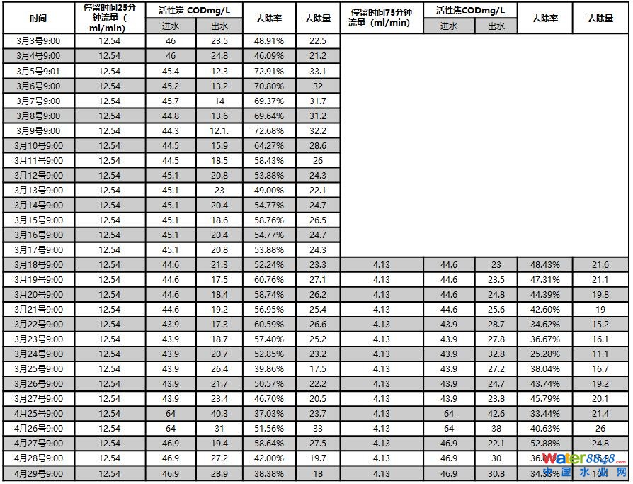 2.因10天后活性焦出水去除率很低,對比實驗不再進行。