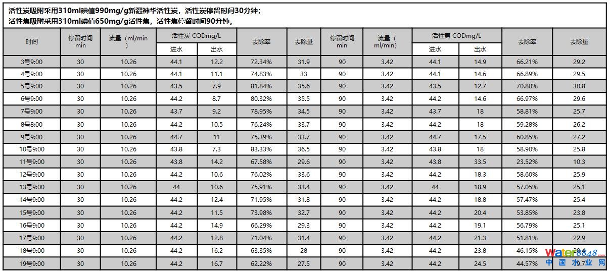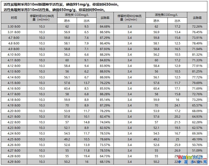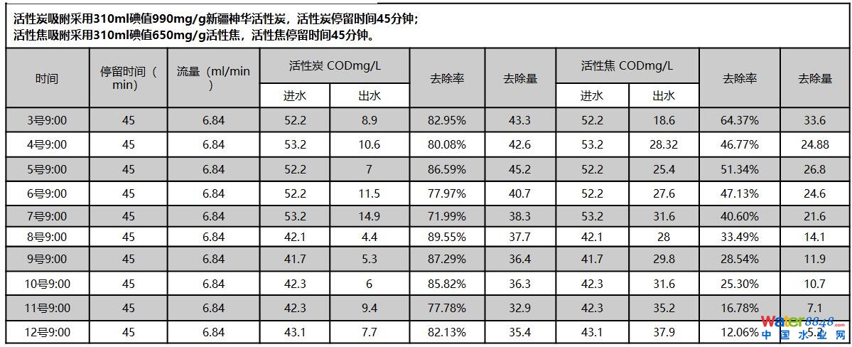 活性焦吸附采用310ml碘值650mg/g活性焦,停留時間75min。