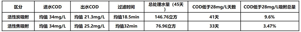 1、活性焦的平均過濾時間為活性炭的1.7倍以上,活性焦吸附的出水仍舊劣于活性炭。若出水要求為地表IV類水(COD≤30),那么活性焦達標天數(shù)比活性炭少8天。