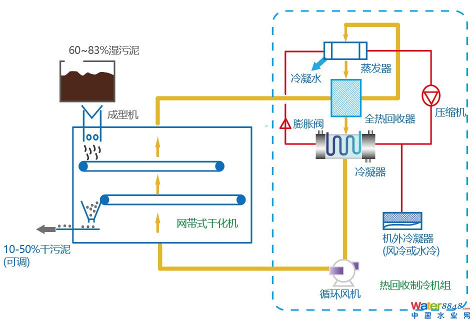 節(jié)能熱泵低溫干化機(jī)是網(wǎng)帶式干燥機(jī)和熱回收制冷機(jī)組的有機(jī)結(jié)合。網(wǎng)帶式干化機(jī)采用低溫?zé)峥諝鉃楦稍锝橘|(zhì),對(duì)污泥進(jìn)行對(duì)流干燥。熱回收制冷機(jī)組采用空氣源熱泵原理對(duì)污泥干燥產(chǎn)生的濕熱空氣進(jìn)行熱回收-熱泵除濕-加熱升溫,使熱空氣和熱能循環(huán)利用,節(jié)能效果顯著。 污泥低溫干化機(jī)只需要消耗少量電能就可以將80%含水率的污泥直接干化至10-40%,減量達(dá)80%。干化后的污泥性質(zhì)穩(wěn)定、熱值提高,可以進(jìn)行摻燒、填埋、建材利用、熱解氣化等。