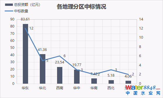 從地理分區(qū)來看,華東有了冠軍山東、季軍安徽的加持,在市場份額上可謂遙遙領(lǐng)先,12大項(xiàng)目訂單總額達(dá)83.61億元,華北地區(qū)總投資額達(dá)41.36億元。西北、東北地區(qū)訂單較少、體量較小。