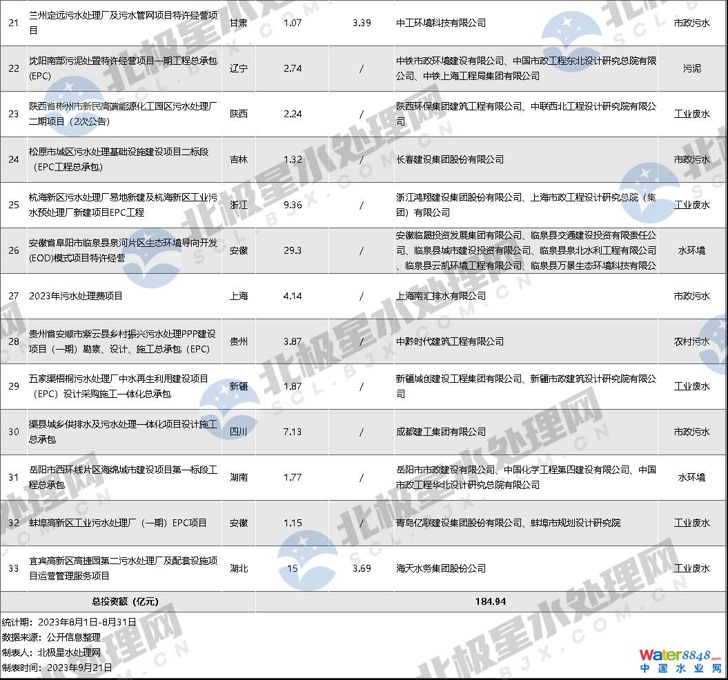 2023年8月中標(biāo)的億級(jí)水處理項(xiàng)目清單如下: