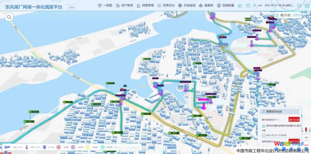 華北院智慧水務(wù)分公司為岳陽市東風(fēng)湖流域搭建的一體化調(diào)度平臺(tái)總控界面