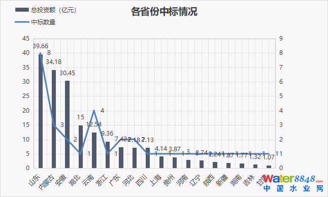 從8月項目中標區(qū)域來看,山東可謂是一枝獨秀,8大項目釋放近40億元的市場份額,投資額占比達21%,居冠軍寶座,內蒙古、安徽緊隨其后,總投資額超30億元,湖北、云南總投資額超10億元。