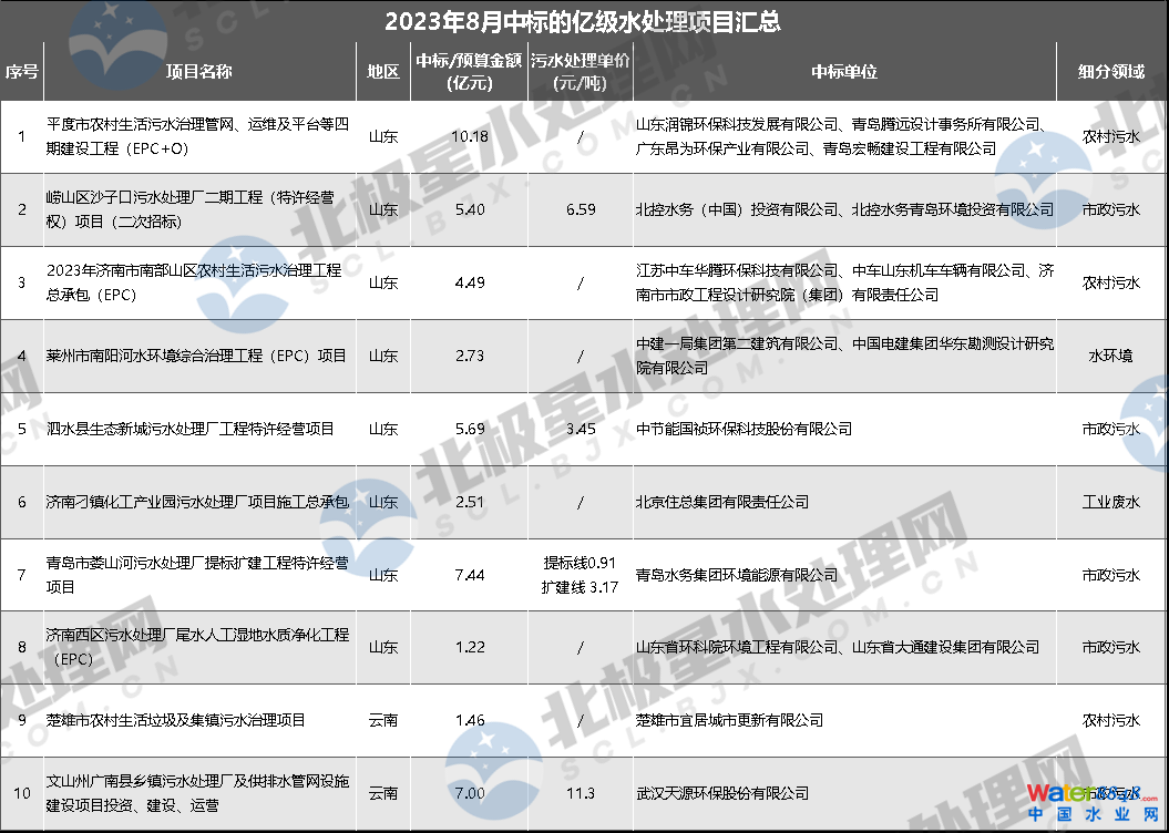 8月億級水處理項目:山東市場加速釋放 北控、國禎等皆有斬獲