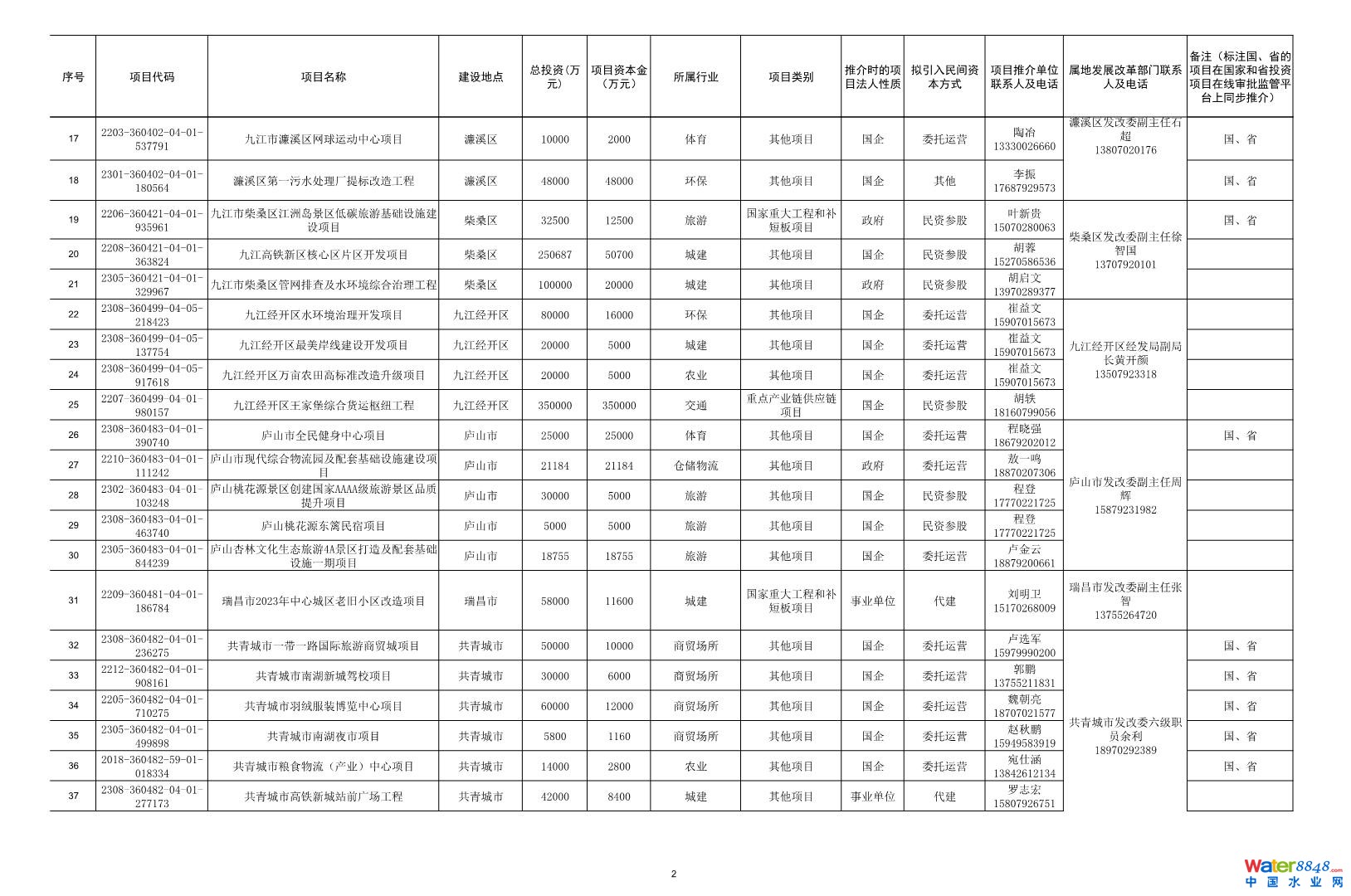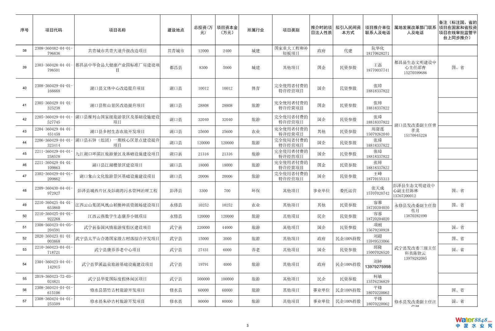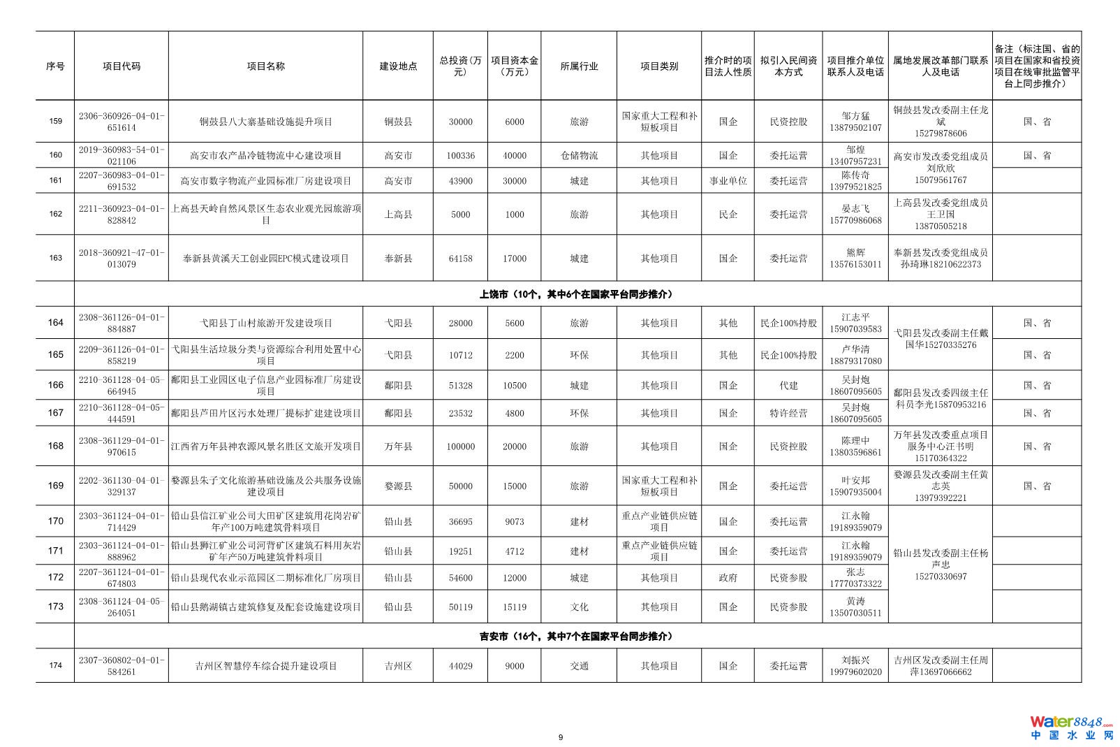 項(xiàng)目名單包括新建區(qū)昌西北污水處理廠及道路管網(wǎng)一體化工程、進(jìn)賢縣城鎮(zhèn)污水處理設(shè)施建設(shè)項(xiàng)目、濂溪區(qū)第一污水處理廠提標(biāo)改造工程、彭澤縣城西片區(qū)及彭湖灣污水管網(wǎng)治理工程、貴溪市城鎮(zhèn)生活污水處理提質(zhì)增效項(xiàng)目、全南縣城區(qū)鎮(zhèn)污水處理廠及管網(wǎng)建設(shè)項(xiàng)目、鄱陽縣蘆田片區(qū)污水處理廠提標(biāo)擴(kuò)建建設(shè)項(xiàng)目、弋陽縣生活垃圾分類與資源綜合利用處置中心項(xiàng)目、灣里管理局水生態(tài)安全改造提升建設(shè)項(xiàng)目、九江經(jīng)開區(qū)水環(huán)境治理開發(fā)項(xiàng)目、江西省九江市德安縣水環(huán)境綜合治理及生態(tài)產(chǎn)品價(jià)值實(shí)現(xiàn)項(xiàng)目、信豐縣餐廚廢棄物處理項(xiàng)目等生態(tài)環(huán)保項(xiàng)目。