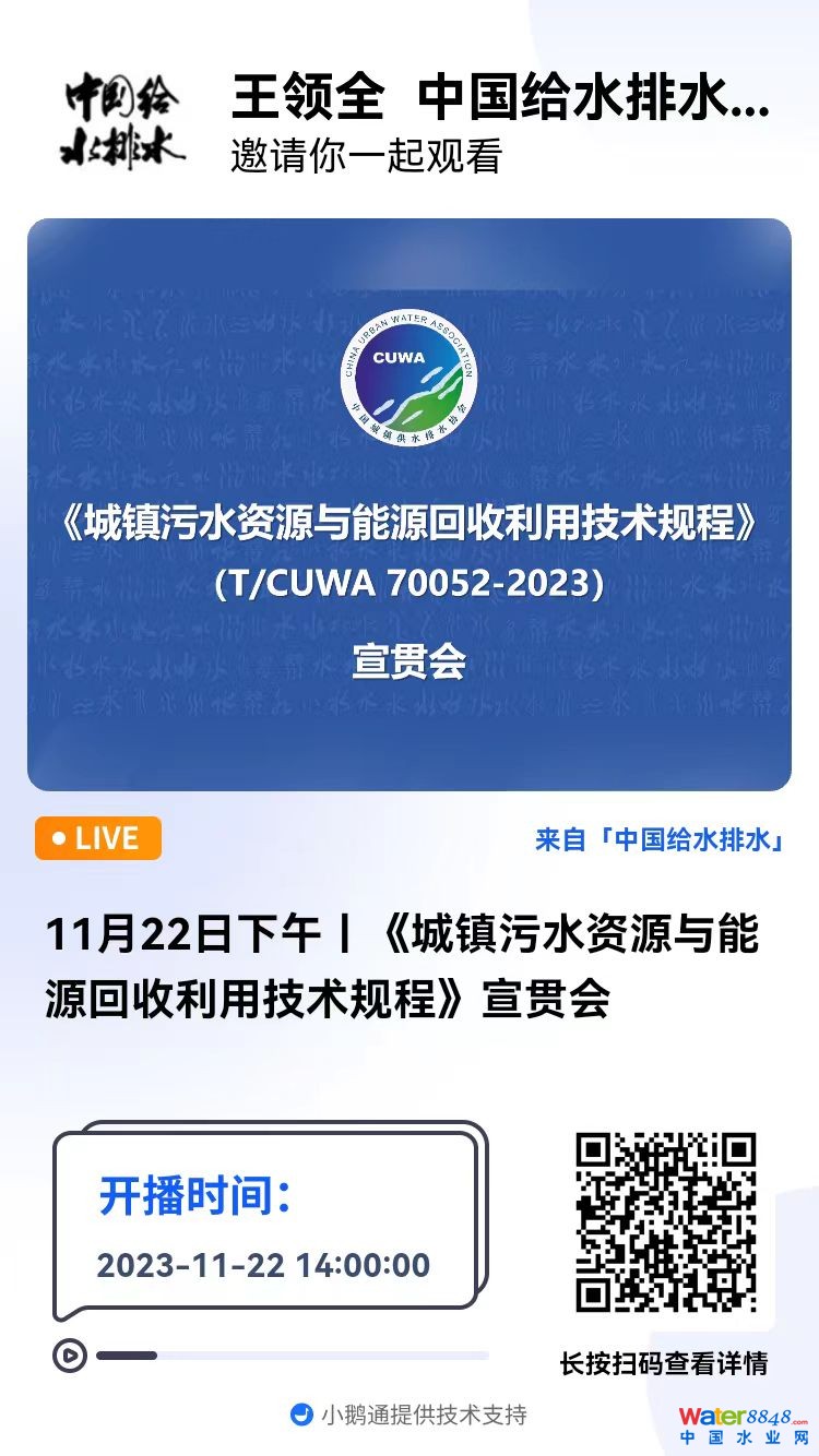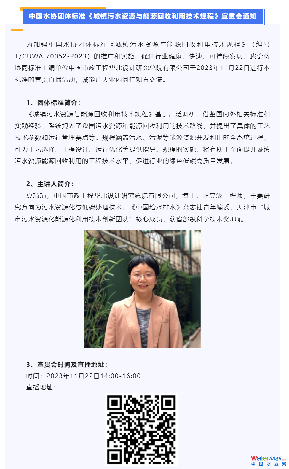 為加強(qiáng)中國水協(xié)團(tuán)體標(biāo)準(zhǔn)《城鎮(zhèn)污水資源與能源回收利用技術(shù)規(guī)程》(編號T/CUWA 70052-2023)的推廣和實(shí)施,促進(jìn)行業(yè)健康、快速、可持續(xù)發(fā)展,我會將協(xié)同標(biāo)準(zhǔn)主編單位中國市政工程華北設(shè)計(jì)研究總院有限公司于2023年11月22日進(jìn)行本標(biāo)準(zhǔn)的宣貫直播活動,誠邀廣大業(yè)內(nèi)同仁觀看交流。