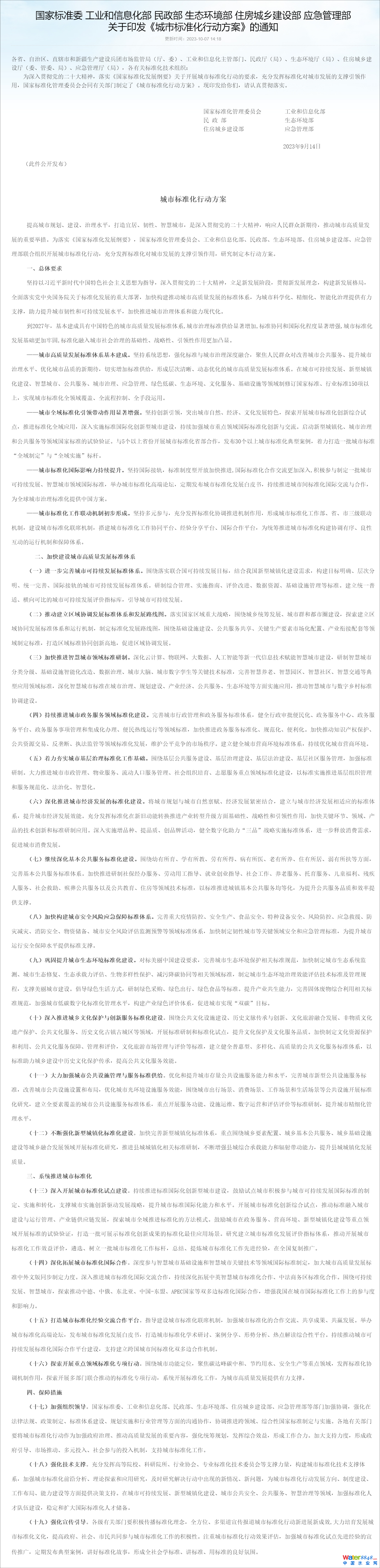 國家標(biāo)準(zhǔn)委 工業(yè)和信息化部 民政部 生態(tài)環(huán)境部 住房城鄉(xiāng)建設(shè)部 應(yīng)急管理部 關(guān)于印發(fā)《城市標(biāo)準(zhǔn)化行動方案》的通知