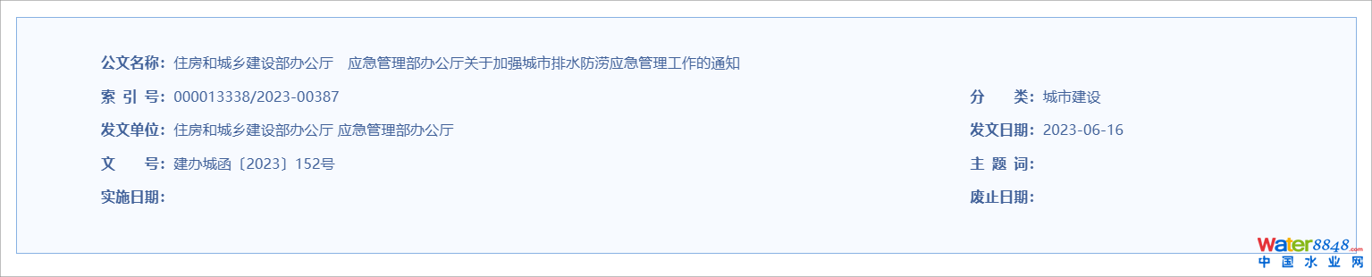 為落實黨中央國務院決策部署和國家防汛抗旱總指揮部工作要求,按照《住房和城鄉(xiāng)建設部辦公廳 國家發(fā)展改革委辦公廳關于做好2023年城市排水防澇工作的通知》(建辦城函〔2023〕99號)要求,請各地進一步完善排水防澇應急機制,做好城市排水防澇應急管理,加強應急處置協(xié)同聯(lián)動,切實保障城市安全度汛,F(xiàn)就有關事項通知如下: