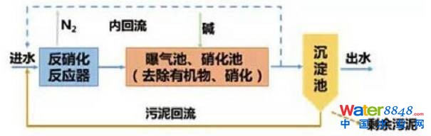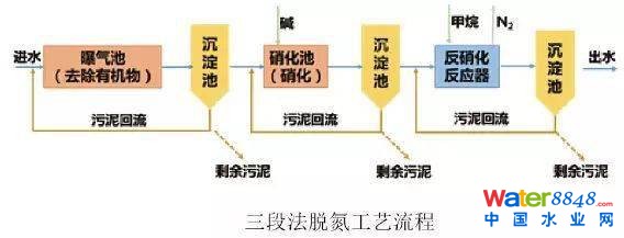 1969年,美國的Barth提出采用三段法除氮,第一段是好氧段,主要去除有機(jī)物,第二段加堿硝化,第三段是厭氧反硝化,除氮。
