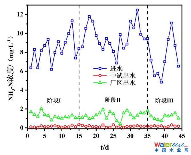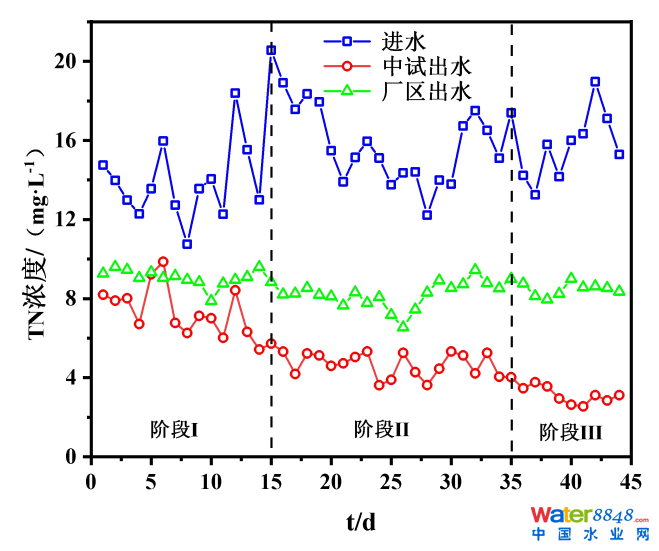 由圖4可知,進水NH3-N為4.84~12.46 mg/L,廠區(qū)出水NH3-N為0.43~2.03mg/L,平均去除率為84.90%,以湖南地標一級分析,在統(tǒng)計的44d運行數(shù)據(jù)中,NH3-N超標率為22.73%,造成NH3-N超標的主要原因為進水營養(yǎng)相對匱乏,接觸氧化池中填料掛膜效果較差,硝化細菌總量不足。中試系統(tǒng)從階段I到階段III,水力停留時間從10.74h逐步縮短至5.37h,出水NH3-N穩(wěn)定低于0.5mg/L,平均去除率高達98.07%,遠優(yōu)于湖南地標一級。由此可知,系統(tǒng)具有良好的硝化活性,分析原因:(1)復(fù)合粉末載體的投加,為世代周期較長的硝化菌生長繁殖提供了棲息場所,提升了系統(tǒng)內(nèi)硝化菌的數(shù)量;(2)復(fù)合粉末載體的投加提升了系統(tǒng)內(nèi)的生物量,微生物的生長代謝可利用部分NH3-N ;(3)載體分離回收系統(tǒng)的水力剪切作用可將活性較差的絮體污泥篩選淘汰,而活性較強的的硝化污泥附著在載體表面通過回收在系統(tǒng)內(nèi)富集,因此系統(tǒng)具有良好的抗沖擊性能,實現(xiàn)對NH3-N的穩(wěn)定去除。