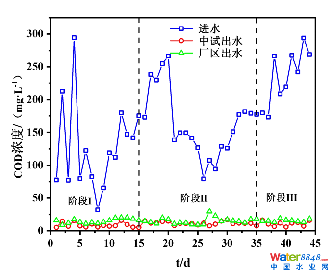 測試期間廠區(qū)和中試系統(tǒng)的COD變化情況如圖3所示。進水COD為77.2~293.72mg/L,波動較大,廠區(qū)出水COD為9~29.75mg/L,平均去除率為88.84%。中試系統(tǒng)出水COD的變化規(guī)律分為3個階段,階段I出水COD為5.05~15.92mg/L,平均去除率為92.11%,該階段載體處于掛膜狀態(tài),COD去除率提升主要歸因于復(fù)合粉末載體具有較大的比表面積,可通過吸附作用實現(xiàn)污染物的快速富集,同時載體在系統(tǒng)內(nèi)處于全流化狀態(tài),增加了微生物、溶解氧和污染物的接觸幾率,有利于系統(tǒng)對COD的去除。而階段II和階段III,水力停留時間縮短至7.16h和5.37h,出水COD分別為5.02~15.19mg/L和5.7~16.46mg/L,平均去除率相較于階段I分別提升了1.25%和3.11%,可穩(wěn)定達標湖南地標一級,表明系統(tǒng)具有良好的抗水質(zhì)水量沖擊能力。載體掛膜后系統(tǒng)對COD的去除進一提升,分析原因為載體投加提升了系統(tǒng)內(nèi)的微生物量,同時有利于某些泥齡較長的專性微生物富集,在生長代謝過程中消耗更多COD。
