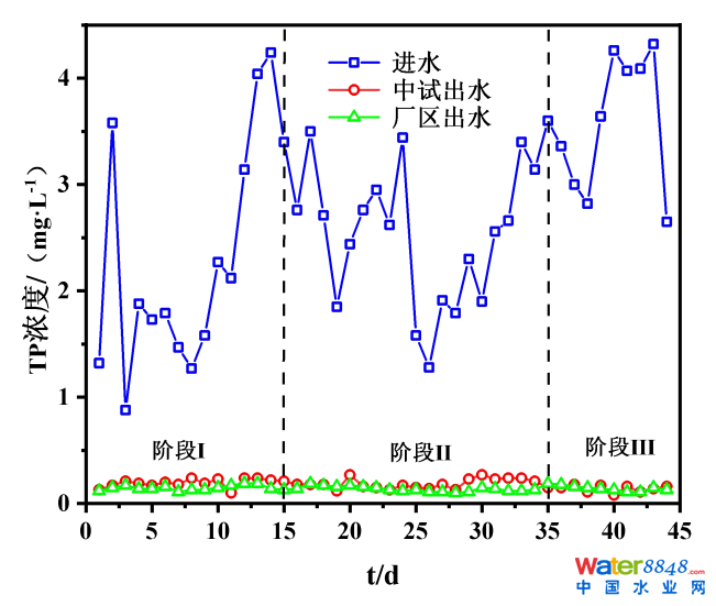 測試期間廠區(qū)和中試系統(tǒng)的TP變化情況如圖6所示。進水TP為0.88~4.32mg/L,廠區(qū)出水TP為0.1~0.19mg/L,平均去除率為93.92%,現(xiàn)狀污水處理廠通過絮凝劑的投加實現(xiàn)了出水TP的穩(wěn)定達標。中試系統(tǒng)各階段的出水TP分別為0.1~0.24 mg/L、0.12~0.27mg/L和0.08~0.18mg/L,平均去除率分別為89.55%、92.2%和95.5%,未投加除磷藥劑,可穩(wěn)定達標湖南地標一級。分析原因如下:(1)載體分離回收系統(tǒng)將載體和附著微生物進行回收利用,將富磷剩余污泥及時排出系統(tǒng),在生化段實現(xiàn)了雙泥齡,強化了脫氮除磷的效果;(2)PY在微生物和溶解氧的作用下,產(chǎn)生的Fe2+和Fe3+可與磷酸鹽發(fā)生化學(xué)反應(yīng)形成難溶的磷酸鹽沉淀;(3)此外,部分Fe3+在水解作用下形成含鐵的羥基絡(luò)合物,通過吸附架橋及卷掃作用加快磷的去除。