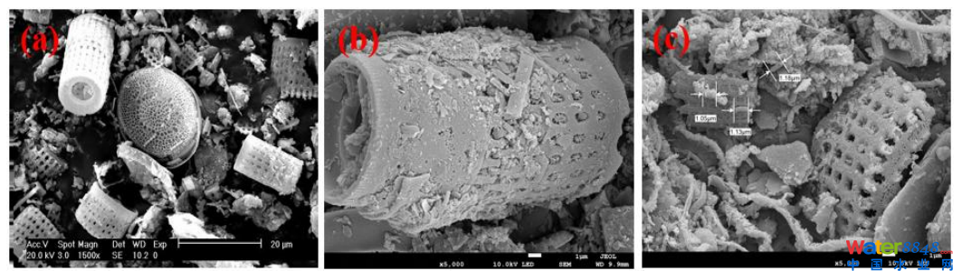 采用掃描電子顯微鏡對掛膜前后載體的微觀形貌進行分析。由圖2a可知,DE呈圓篩狀和原柱狀,殼體表面較為光滑,分布著大量孔徑大小不一的多孔狀結(jié)構(gòu)。DE具有較大的比表面積和良好的生物親和性,可為附著型微生物的生長繁殖提供棲息場所。PY呈不規(guī)則塊狀結(jié)構(gòu),粒徑分布在1~10um,可作為自養(yǎng)反硝化的電子供體,通過共沉降均勻負載于DE表面 (圖2b)。從圖2c可以發(fā)現(xiàn),污泥絮體與載體緊密結(jié)合,富集了大量的絲狀菌、桿菌、球菌等微生物,提高了系統(tǒng)內(nèi)的微生物數(shù)量,有利于污染物的去除。