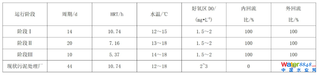 中試試驗分為3個階段,具體見表1。階段I為啟動階段,向裝置內(nèi)投加復(fù)合粉末載體提升污泥濃度,維持現(xiàn)狀污水處理廠相同的HRT進行載體掛膜,同步啟動載體分離回收單元進行排泥,實現(xiàn)復(fù)合粉末載體的回收循環(huán),后續(xù)運行過程中復(fù)合粉末載體每日補充量控制在5mg/L;階段II為穩(wěn)定測試階段,主要考察A2/O-HPB工藝在設(shè)計工況下的運行效果;階段III為水量沖擊階段,水力停留時間縮短至5.37h,日處理水量翻倍,考察系統(tǒng)的抗沖擊負荷能力。