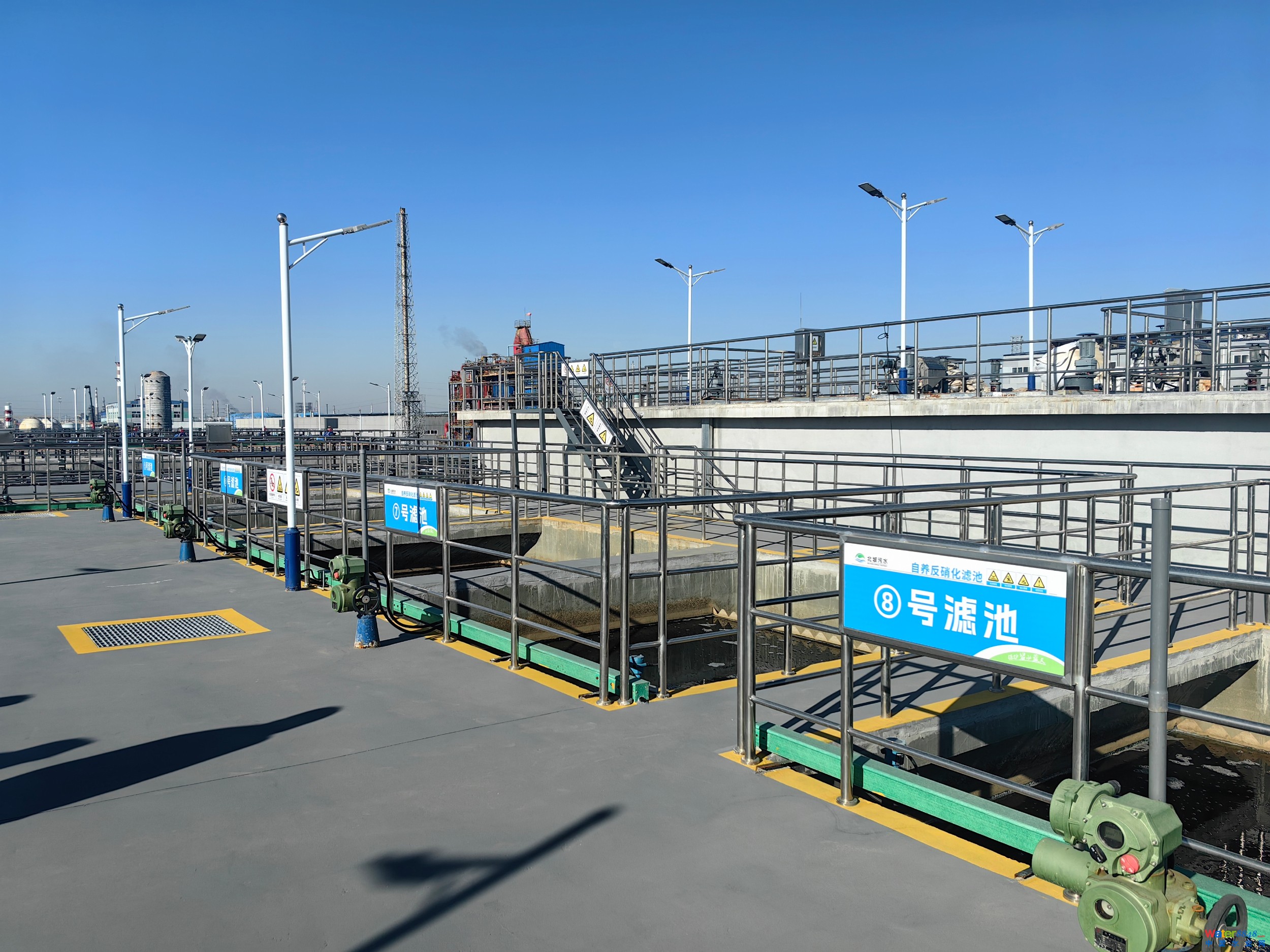 在山東省濱州市北城污水處理有限公司,記者近日看到,8個自養(yǎng)反硝化濾池整齊排列,污水處理設施正常運轉(zhuǎn)。查閱中控系統(tǒng)數(shù)據(jù)顯示,進水總氮為48.68mg/L,出口總氮為7.91mg/L。