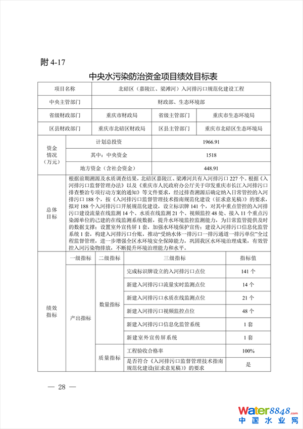 二、本次資金實(shí)行“因素法分配、項(xiàng)目法下達(dá)”,我局已會(huì)同市生態(tài)環(huán)境局從中央水污染防治資金項(xiàng)目庫中擇優(yōu)選定了支持項(xiàng)目,請(qǐng)你們按附件2項(xiàng)目清單及時(shí)將資金匹配到具體項(xiàng)目,并會(huì)同行業(yè)部門抓緊完善前期工作,力促盡快形成實(shí)物投資量,確保2024年開年后資金有效支出。預(yù)算執(zhí)行情況和項(xiàng)目實(shí)施進(jìn)展須按季度報(bào)送市生態(tài)環(huán)境局和市財(cái)政局。