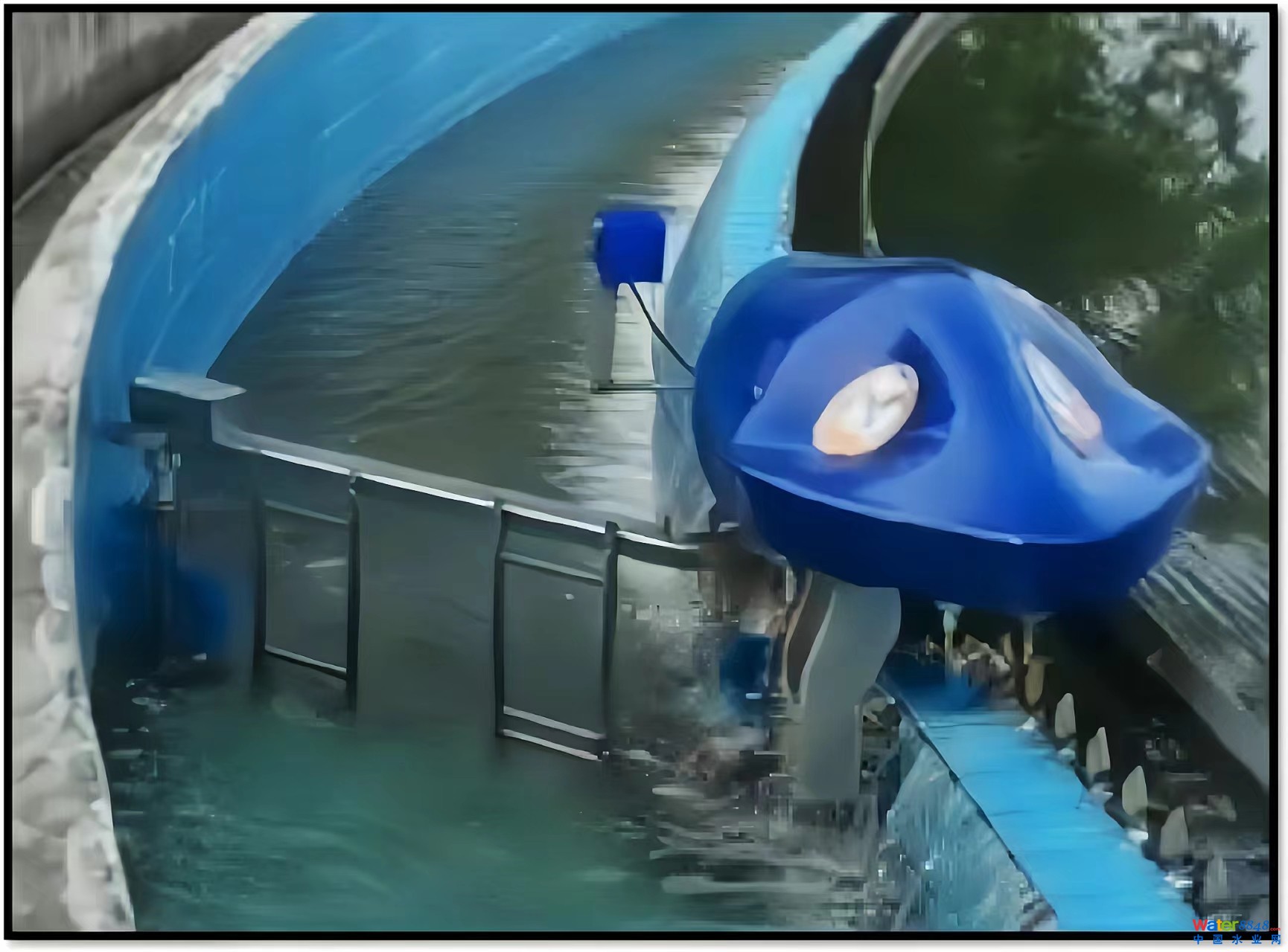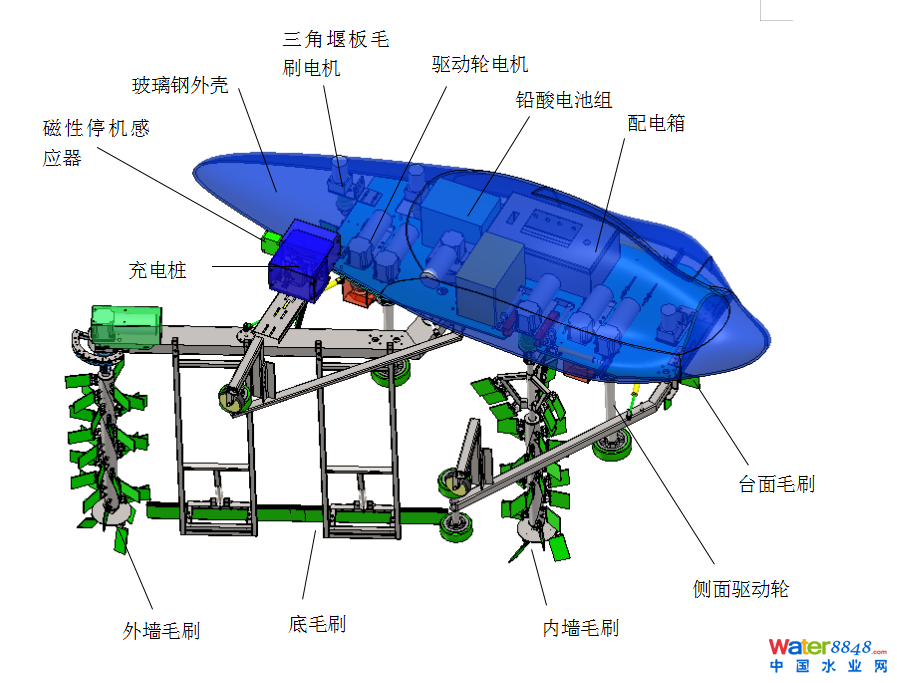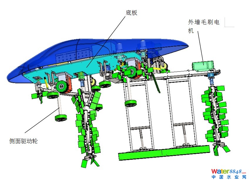 4、清洗機(jī)器人具有仿生功能,搖臂主毛刷隨輸水道外側(cè)漸開線池壁寬窄變化自動調(diào)整,使被清洗的曲線弧面更加干凈、徹底。