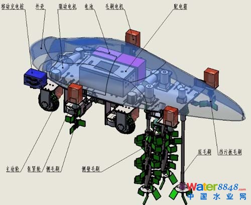 4、清洗機(jī)器人具有仿生功能,搖臂主毛刷隨輸水道外側(cè)漸開線池壁寬窄變化自動(dòng)調(diào)整,使被清洗的曲線弧面更加干凈、徹底。