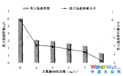 由圖可以看出,向二級(jí)出水中投加次氧酸鈉后,糞大腸菌群數(shù)明顯銳減,且當(dāng)次氯酸鈉投加量在2mg/L以上時(shí),糞大腸菌去除率均在99%以上。