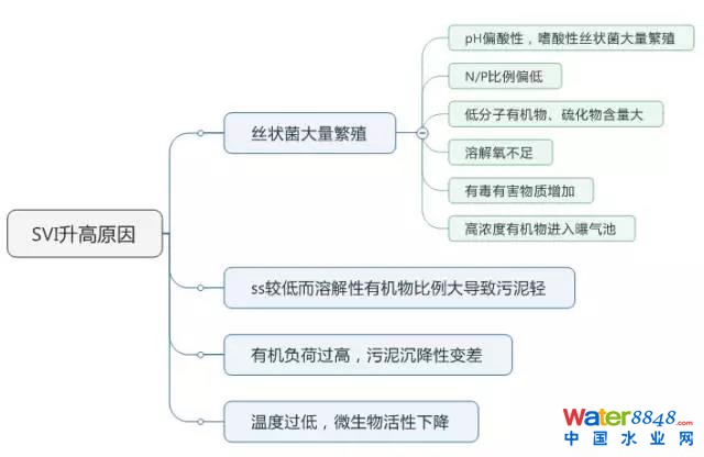 SVI值與污泥負(fù)荷有關(guān),污泥負(fù)荷過(guò)高或過(guò)低,活性污泥的代謝性能都會(huì)變差,SVI值也會(huì)變很高,存在出現(xiàn)污泥膨脹的可能。