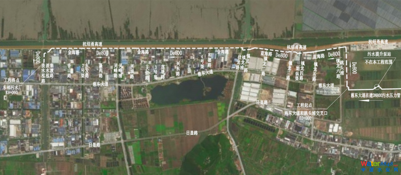 該工程為寧波市慈溪濱海經(jīng)濟(jì)開發(fā)區(qū)的污水管線新建工程,鋪設(shè)內(nèi)徑八百毫米聚乙烯壓力管,經(jīng)慈東大道鋪設(shè)至九公里外的慈溪東部污水處理廠。