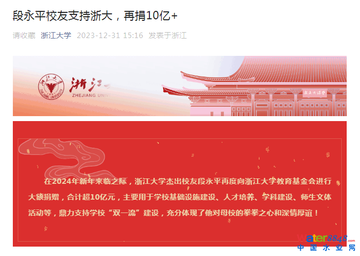 在2024年新年來臨之際,浙江大學(xué)杰出校友段永平再度向浙江大學(xué)教育基金會進行大額捐贈,合計超10億元,主要用于學(xué);A(chǔ)設(shè)施建設(shè)、人才培養(yǎng)、學(xué)科建設(shè)、師生文體活動等,鼎力支持學(xué)校“雙一流”建設(shè),充分體現(xiàn)了他對母校的拳拳之心和深情厚誼!