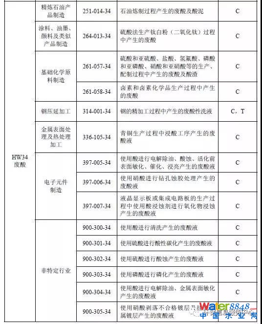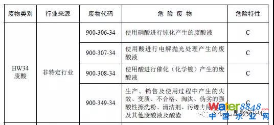 主要包括石油煉制過程產(chǎn)生的廢酸及酸泥,硫酸法生產(chǎn)鈦白粉(二氧化鈦)過程中產(chǎn)生的廢酸,硫酸和亞硫酸、鹽酸、氫氟酸、磷酸和亞磷酸、硝酸和亞硝酸等的生產(chǎn)、配制過程中產(chǎn)生的廢酸及酸渣,鹵素和鹵素化學品生產(chǎn)過程中產(chǎn)生的廢酸,鋼的精加工過程中產(chǎn)生的廢酸性洗液,青銅生產(chǎn)過程中浸酸工序產(chǎn)生的廢酸液,使用酸進行電解除油、酸蝕、活化前表面敏化、催化、浸亮產(chǎn)生的廢酸液,使用硝酸進行鉆孔蝕膠處理產(chǎn)生的廢酸液,液晶顯示板或集成電路板的生產(chǎn)過程中使用酸浸蝕劑進行氧化物浸蝕產(chǎn)生的廢酸液,使用硫酸進行清洗、碳化、酸蝕產(chǎn)生的廢酸液,以及生產(chǎn)、銷售及使用過程中產(chǎn)生的失效、變質(zhì)、不合格、淘汰、偽劣的強酸性擦洗粉、清潔劑、污跡去除劑以及其他廢酸液及酸渣等。