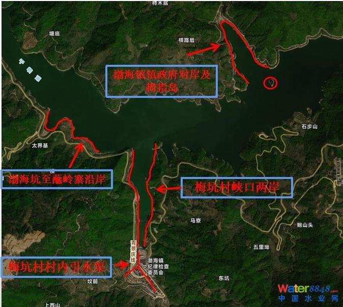 項目治理范圍全長6km,主要為梅坑村村內(nèi)引水渠、渤?又琳簬X寨沿岸、渤海鎮(zhèn)鎮(zhèn)政府對岸、拇指島及梅坑村峽口沿岸。工程主要對項目范圍內(nèi)的駁岸進行修復(fù),構(gòu)建生態(tài)緩沖帶,并將拇指島打造成生態(tài)小島,提升流域自凈能力,減少水土流失;同時通過漂浮濕地的構(gòu)建,有效削減沿岸生產(chǎn)生活產(chǎn)生的面源水體中的污染物,進一步提高水質(zhì);并對村內(nèi)的硬化溝渠進行生態(tài)改造,為水生動植物提供生存空間,恢復(fù)溝渠生態(tài)系統(tǒng)。