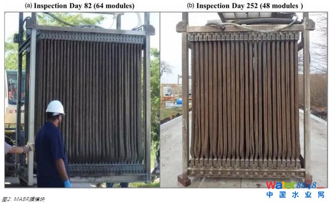 試驗周期為296天,實際分為了兩期,如下圖所示,前145天為第一期,膜箱含有64個模塊組件,后151天為第二期,從原來的64個組件移除16個,以此檢驗?zāi)た臻g密度對運(yùn)行表現(xiàn)的影響。