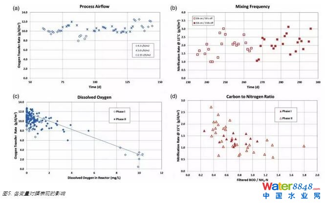 項目組還就曝氣量對OTR的影響進(jìn)行了測試,在第60-144天內(nèi),他們將曝氣量從4.3L/h/㎡逐步減少至3.0L/h/㎡(30%減少量),直至2.1L/h/㎡(50%減少量),然后在回升至4.3L/h/㎡。結(jié)果顯示30%的減少率并沒有明顯影響,但50%的減少量使OTR降低了20%。這是因為出氣氧含量的減少降低了通過膜的氧氣的滲透率。圖5(b)顯示了膜箱的混合頻率對硝化速率沒有影響。圖5(c)則顯示MABR在DO低于1mg/L的時候運(yùn)作最佳。圖5(d)表明硝化速率越高,反硝化和BOD去除效果越好。