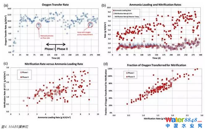 MABR膜表現(xiàn)通常用膜表面積來表示(如下圖4),單位面積的OTR相當(dāng)平穩(wěn),維持在8-12g-O2/d/㎡之間,其中第一階段約27kg/d,第二階段為20kg/d。報告指出有三個階段的數(shù)據(jù)沒有用于平均值的計算,包括第1-21天的生物膜啟動器,第87-93天的曝氣速率的減少調(diào)整期,以及第267-276天的氧氣測試出現(xiàn)狀況的時候。