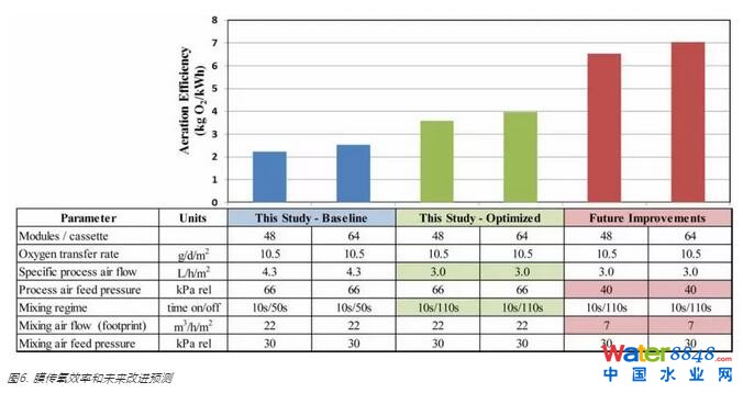 研究團(tuán)隊指出,本次測試只展示了上述優(yōu)點中的第三個,而且也沒有得到完美體現(xiàn)。由于規(guī)模問題,這個實驗的曝氣是由壓縮機(jī)而不是低壓風(fēng)機(jī)時間的,所以無法直接監(jiān)測能效。另外只有一個膜箱不能充分利用間歇式的混合曝氣,這需要更多的膜箱。盡管如此,作者認(rèn)為通過圖6的曝氣效率的計算,已經(jīng)可以體現(xiàn)出MABR膜的潛在效能。
