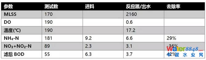 結(jié)果顯示MABR反應(yīng)器的MLSS與主線情況相似,平均值為2,160mg/L。DO值能基本維持為0,異常情況跟下雨、融雪和低碳氮負(fù)荷有關(guān)。出水氨氮為2.6mg/L(約70%的去除率)。過濾后的進(jìn)水BOD值已經(jīng)相當(dāng)?shù)?6.6mg/L),去除率約42%。平均的C/N比只有0.73,相當(dāng)?shù)汀?/p>