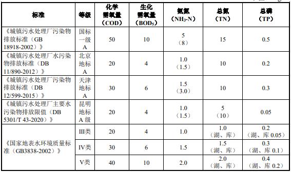 《城鎮(zhèn)污水處理廠污染物排放標準(GB18918-2002)》的最高標準即一級 A標準中,其主要指標的排放要求均低于(或等于)地表水 V 類標準,總體屬于劣 V 類水質(zhì)。近年來,為促進景觀河湖水體的水質(zhì)提升,推動流域生態(tài)環(huán)境的持續(xù)改善,部分城市或地區(qū)先后制定并執(zhí)行了更為嚴格的污水處理廠污染物排放地方標準,進一步拉動污水處理廠提標改造的市場需求。以北京、天津、昆明為例,上述地區(qū)執(zhí)行的污水處理廠污染物排放的地方標準與國家標準以及地表水環(huán)境質(zhì)量標準的對比如下表所示: